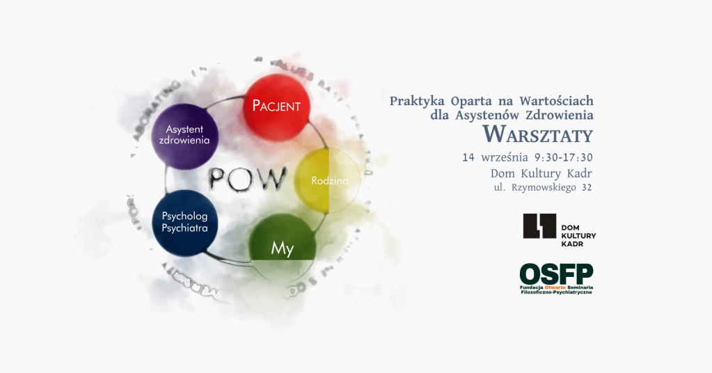 Fundacja Otwarte Seminaria Filozoficzno-Psychiatryczne serdecznie zaprasza na warsztaty z Praktyki Opartej na Wartościach (POW) dedykowane osobom, które ukończyły, są w trakcie szkoleń lub zastanawiają się nad zostaniem asystentami zdrowienia, a także osoby bliskie oraz członków rodzin osób z doświadczeniem kryzysu psychicznego.